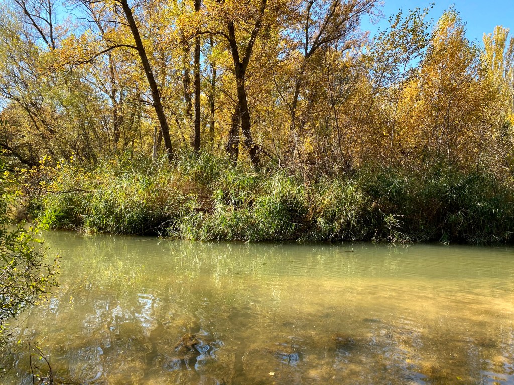 el agua verde y estanca refleja la otoñada,