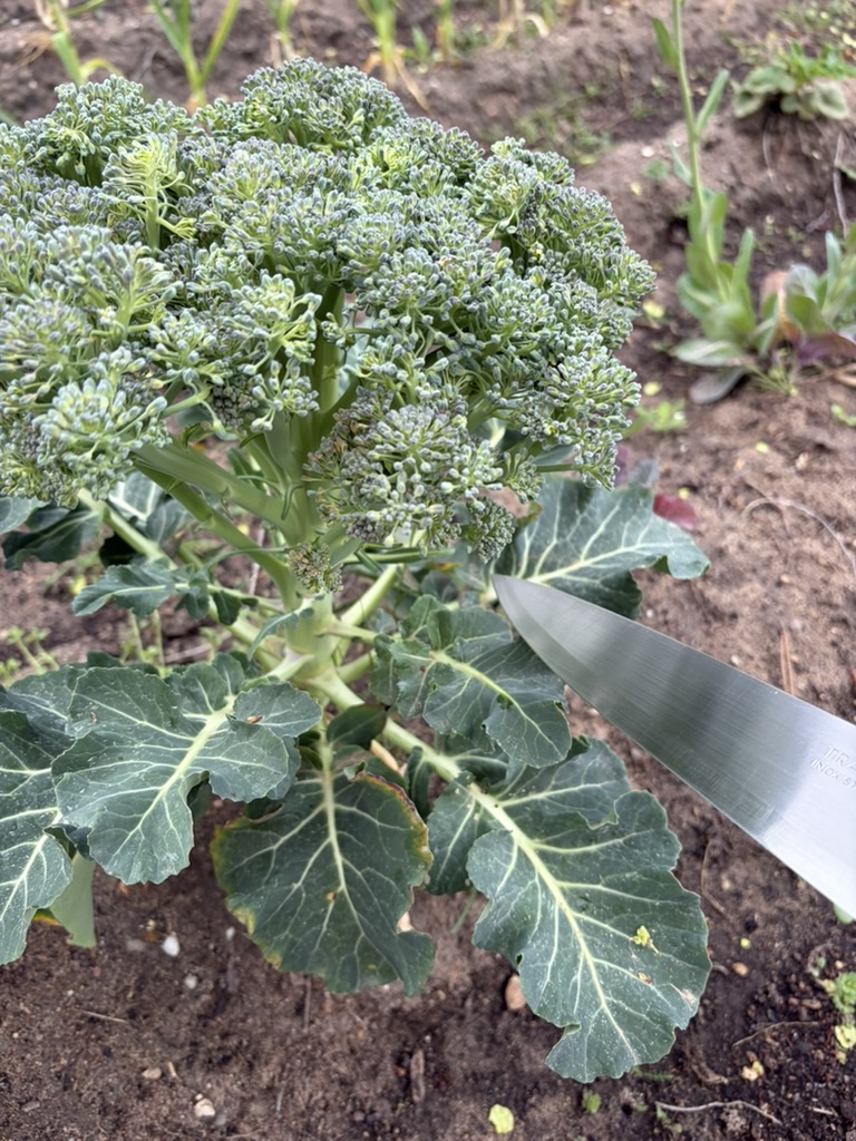 el corte del brócoli en el huerto con un cuchillo gigante,