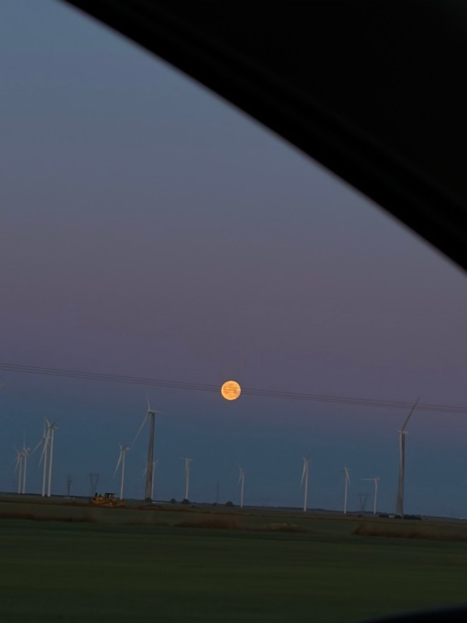la luna poniente silueteando los modernos molinos